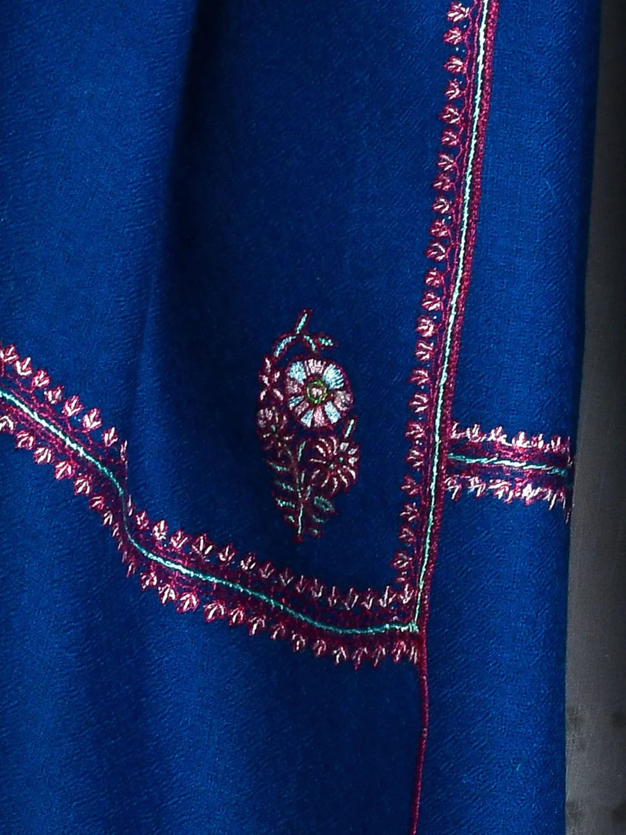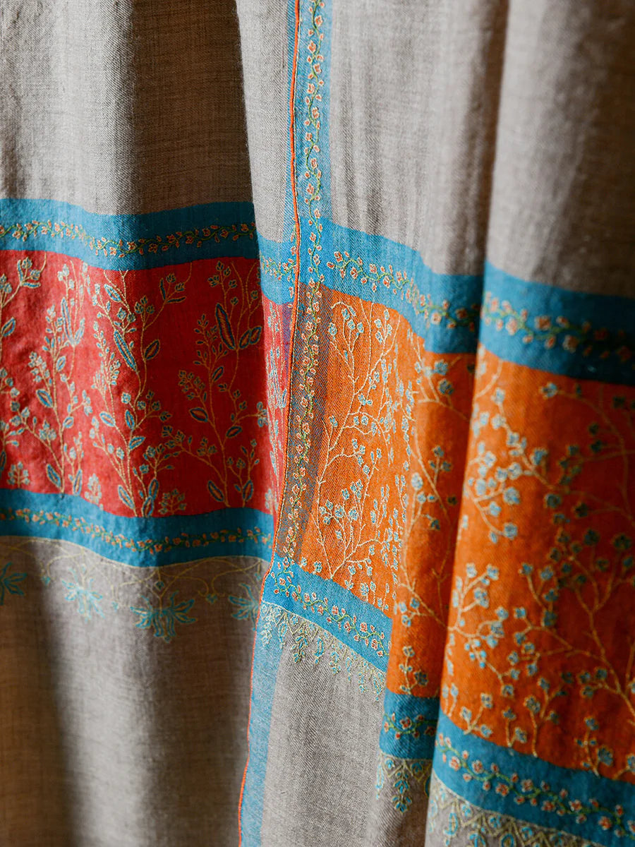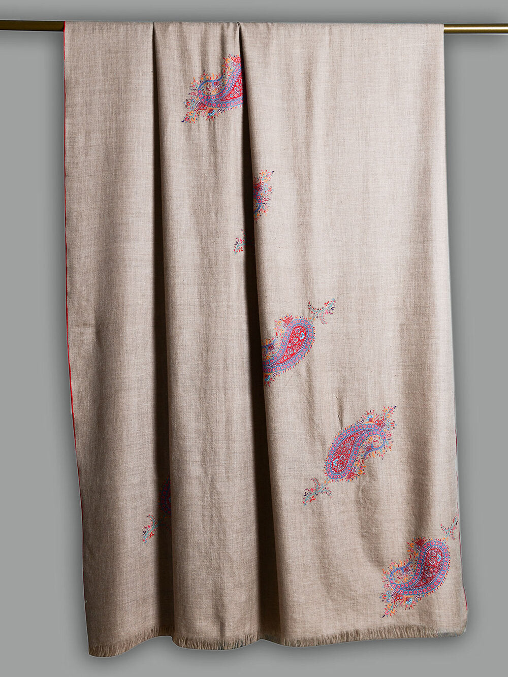 Bale or Baledaar is the original name for the straight line of colorful embroidery on all four sides of a shawl (usually measuring about 2-3 cms). The Bale was usually a highlight on the edges. Traditionally, the four corners of the shawl would have a Boteh each on the inside of the Bale, placed at an angle of 45 degrees pointing to the center of shawl. At Andraab we embroider the Bale as a single colour in order to enhance its minimalistic feel, bringing a freshness to the design.