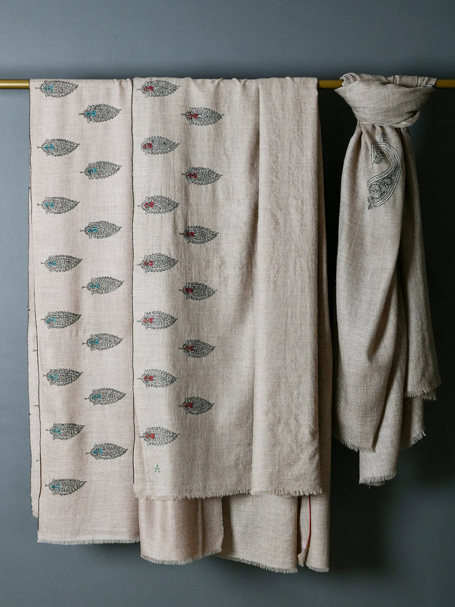 The craft of shawl-weaving came to Kashmir seven centuries ago from eastern Persia and central Asia. Kashmir shawls were heavily influenced by the original designs and motifs. The Botehs find extensive use in the craft of the Kashmiri shawl, both in terms of the woven Kaani design as well as the embroidered versions. Andraab’s version of the Boteh modernizes the shapes and plays with designs and variations of all-over botehs, palla botehs and miniscule boteh versions to make each shawl unique.