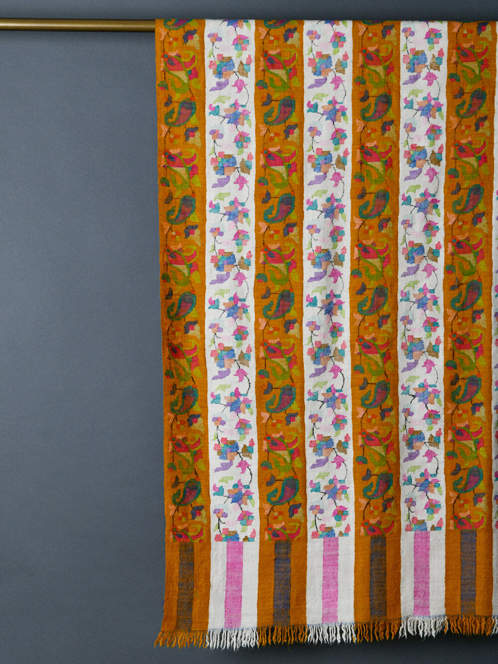 Kaani is a shawl woven with bobbins (called kaani in the local language) on a double twilled loom. Each shawl can take from 2 months to 2 years on the loom to finish. Andraab is proud and honoured to employ a few of the remaining handful of weavers who are masters of this technique.