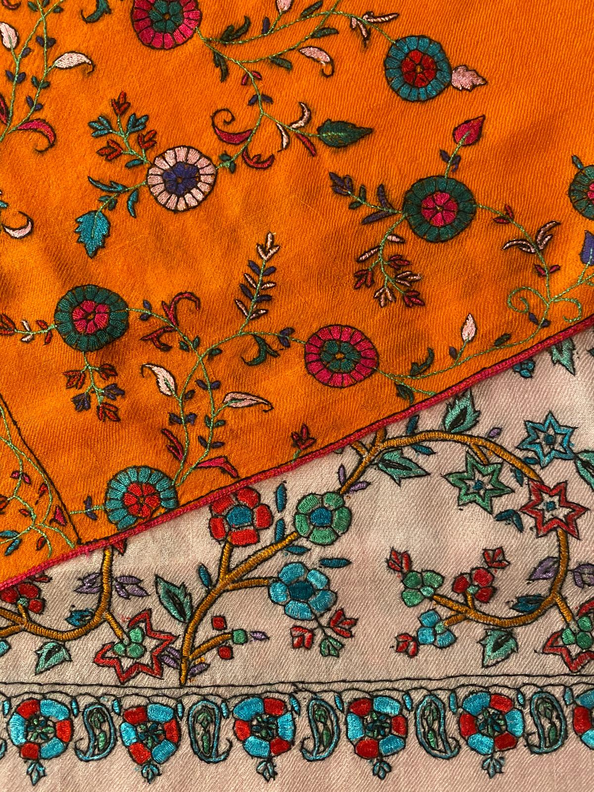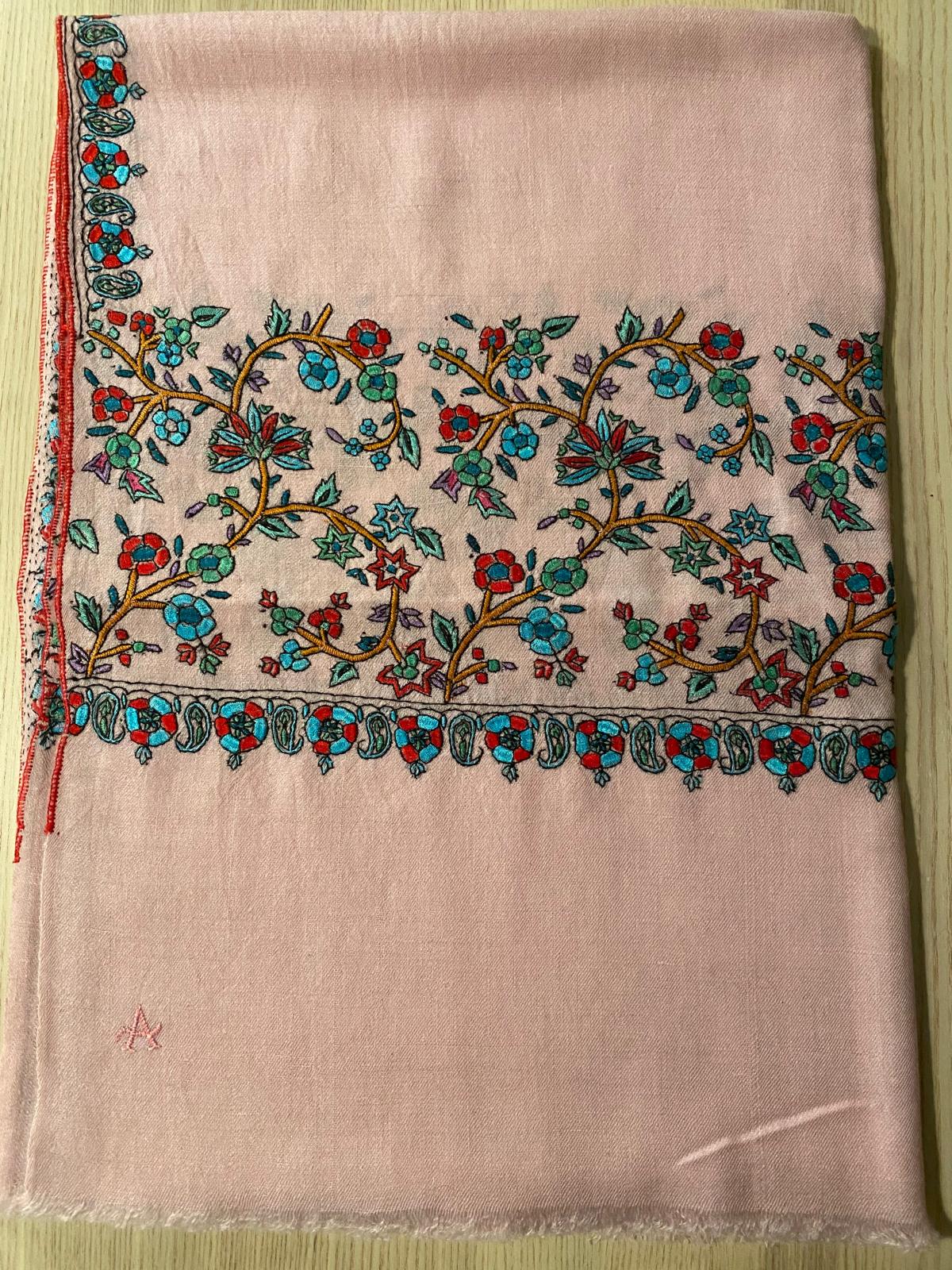 A delicate blush pashmina adorned with floral vines in contrasting hues.